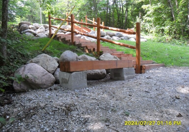 Des amoncellements et de petits murets en roches morainiques locales ont été incorporés aux aménagements des haltes afin d’évoquer les clôtures de roches délimitant les champs de fermes laitières et de culture retrouvés à plusieurs endroits dans la MRC.