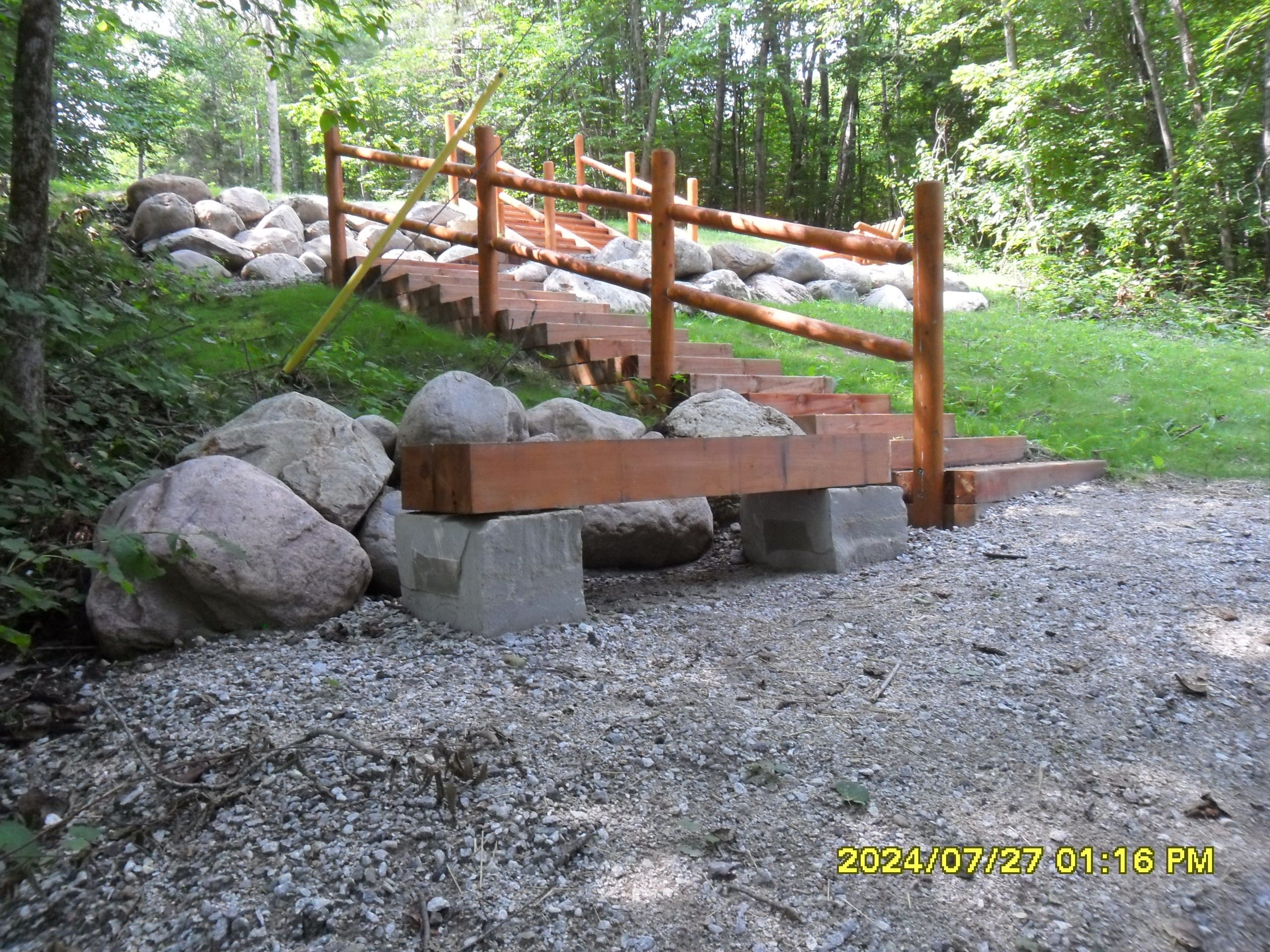 Vue d’un banc rustique composé de deux pierres taillées et de deux poutres de bois durable.